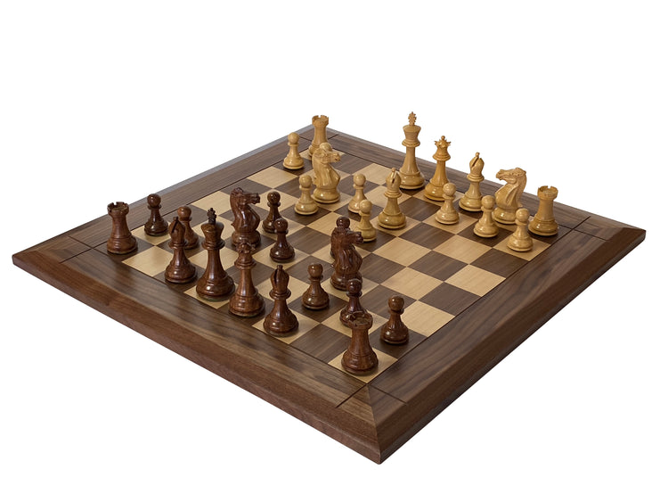 Our 3.5” Stallion Acacia Wide Border Walnut Chess Set & Box is a superb hand-carved chess set with a King Height of 3.5". It comes with Acacia and Hardwood Boxwood Weighted and Felted bases, matched with a 20" Walnut Maple wide border chessboard. This set also comes with a basic standard MDF veneer box to store pieces when not in use- Box style colour may change depending on the stock at the time of order.