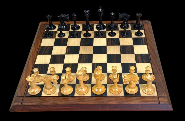 Complementing this masterful set is a 21-inch chessboard, handcrafted from ebony rosewood and boxwood. The inlaid 2.25-inch squares offer a perfect fit for the full-sized pieces, while the high-gloss finish brings out the rich grain of the woods. The bevelled edging adds a final touch of luxury, making this board as much a display piece as a playing surface.