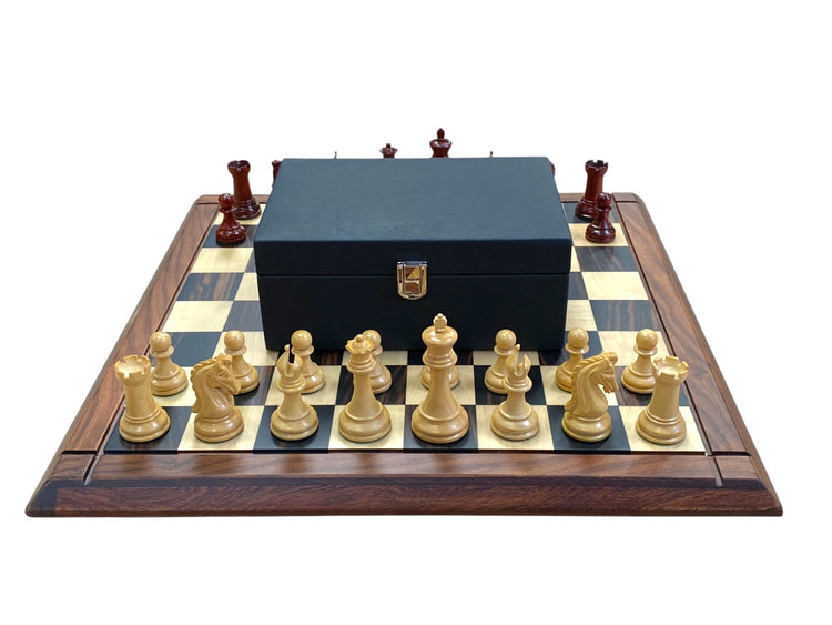 Paired with this is our 21-inch luxury chess board, crafted from rich ebony rosewood and boxwood, with precision inlaid 2.25-inch squares. The polished surface brings out the dramatic grain of the rosewood, offering a truly regal setting for the vivid hues of the padauk pieces. A gently bevelled edge and flawless craftsmanship ensure that the board itself is worthy of admiration.