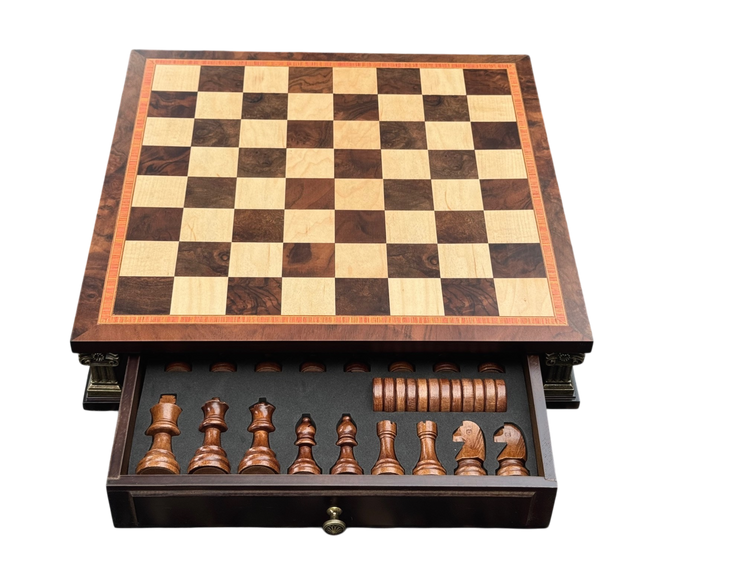Handcrafted from burl walnut, this 15-inch chess set combines timeless elegance with practical functionality. Weighted pieces sit securely on the board, while dual integrated drawers provide discreet storage for the complete set.