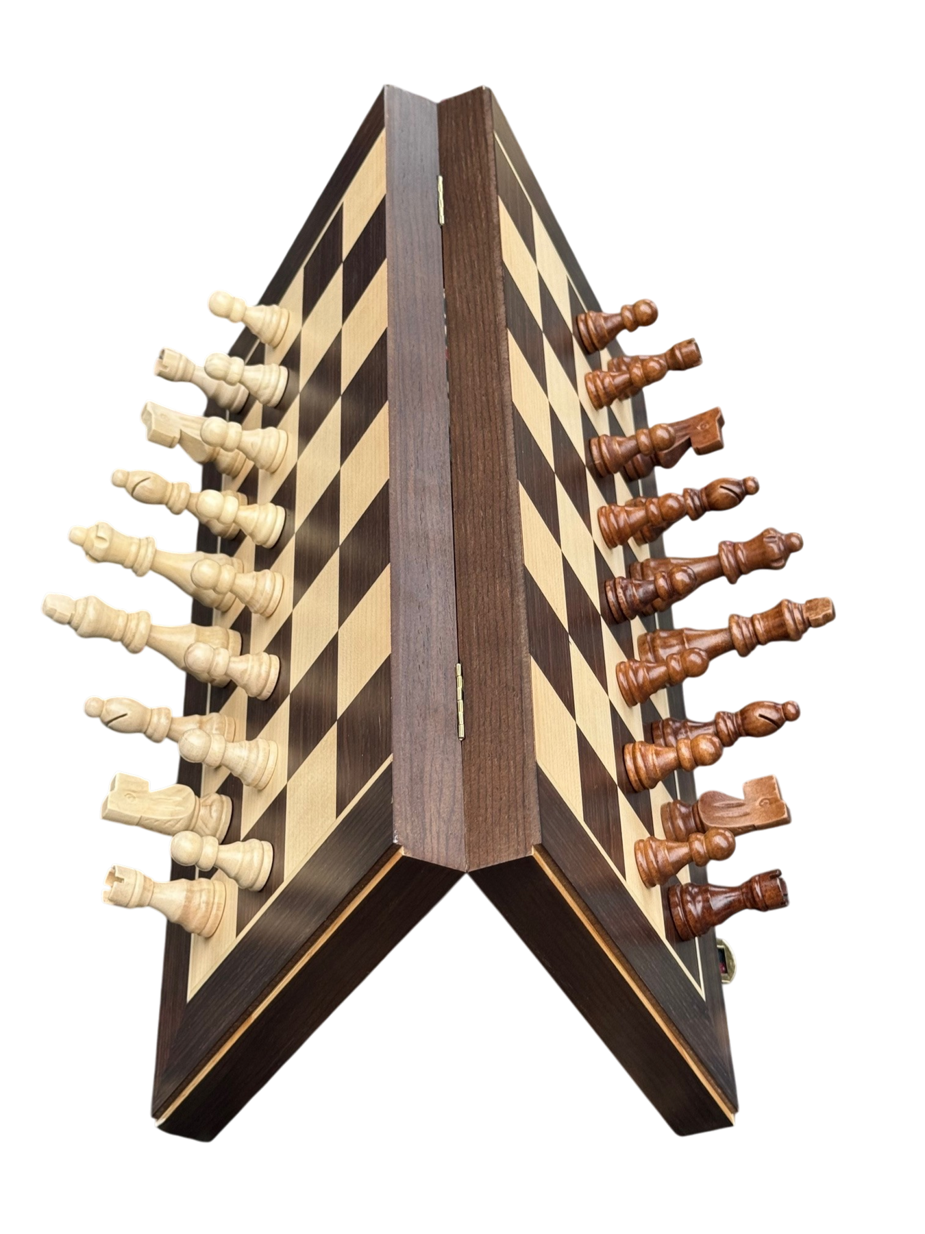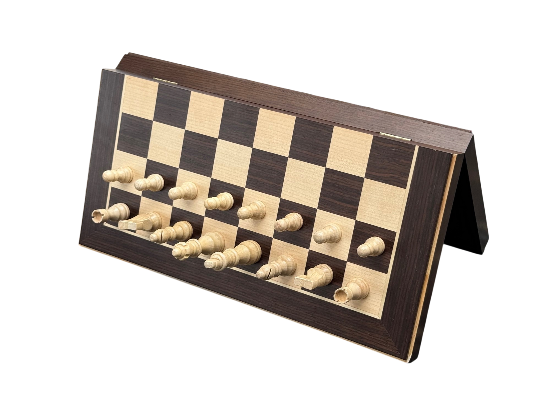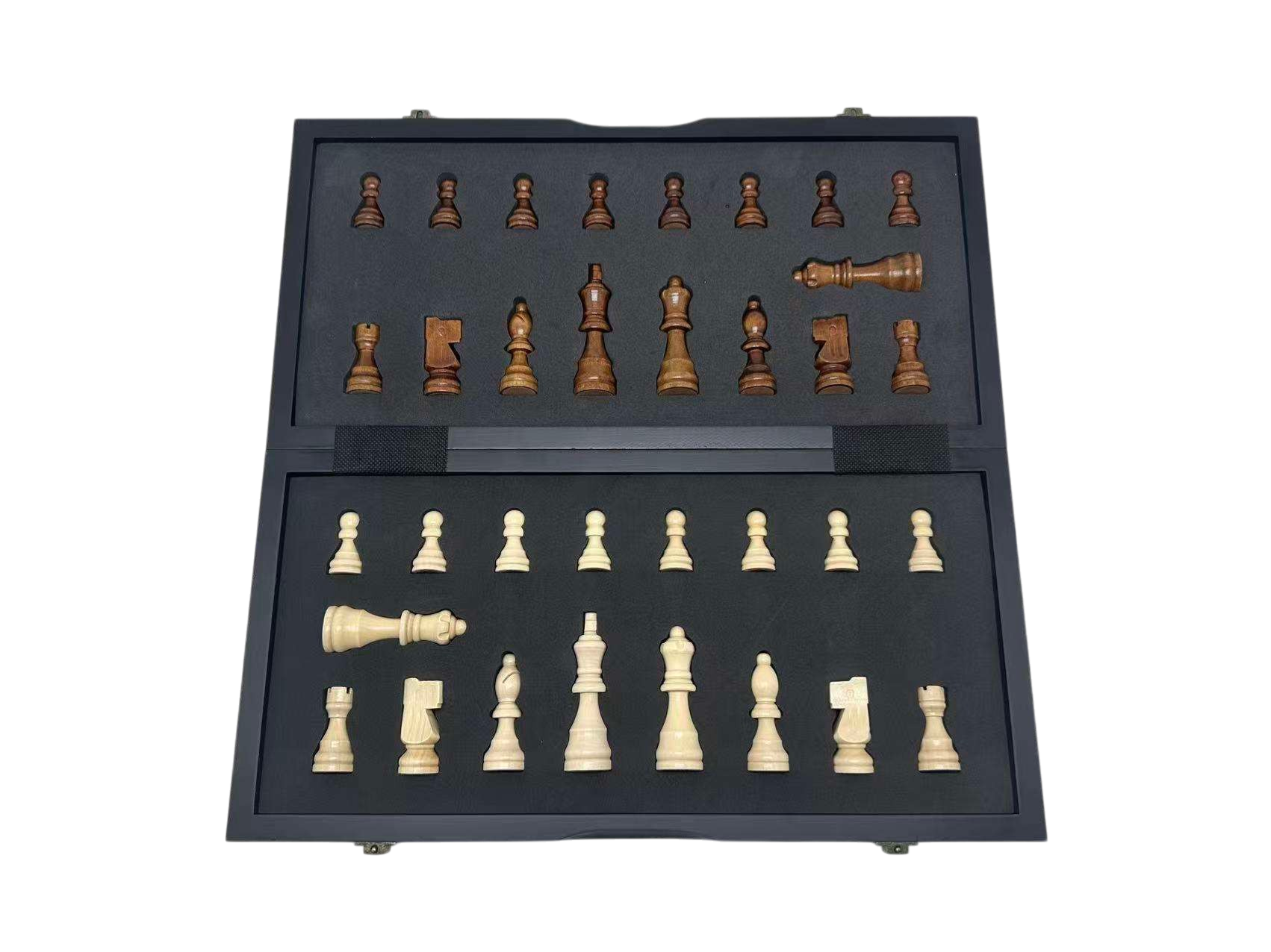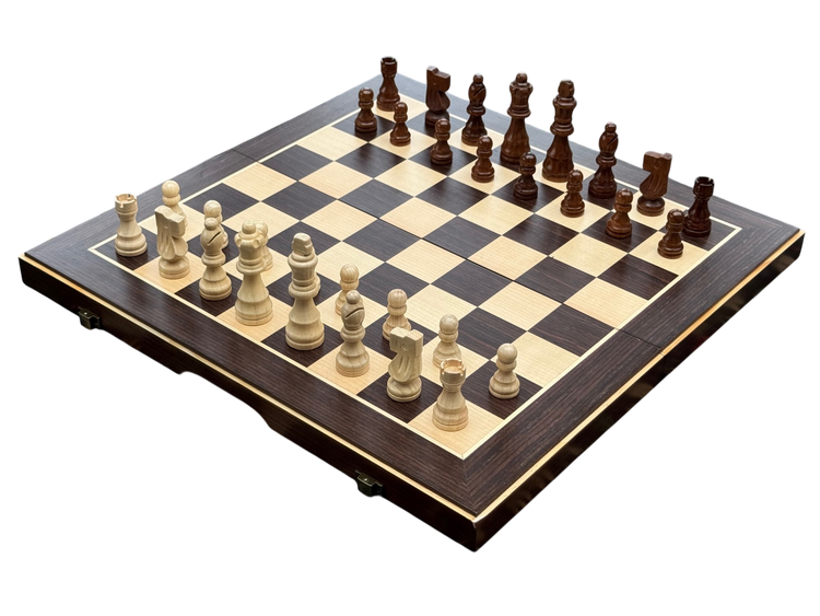 An accessible entry point chess set. This 15" folding set combines wenge ebony and maple wood veneers for visual contrast, with magnetic pieces that stay secure during play or transport.