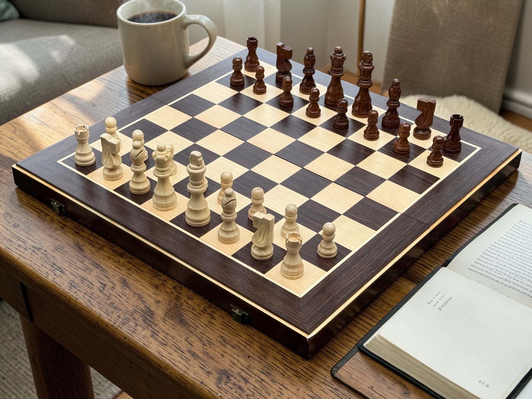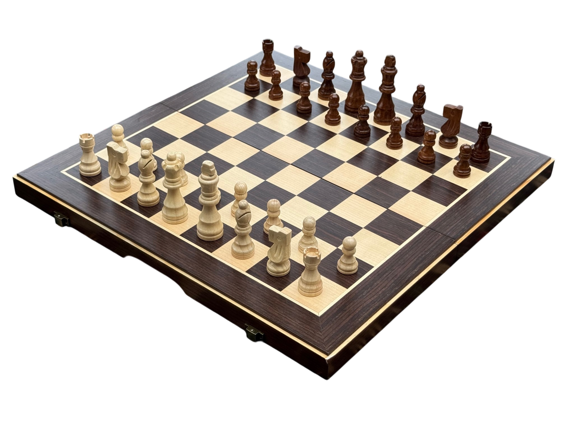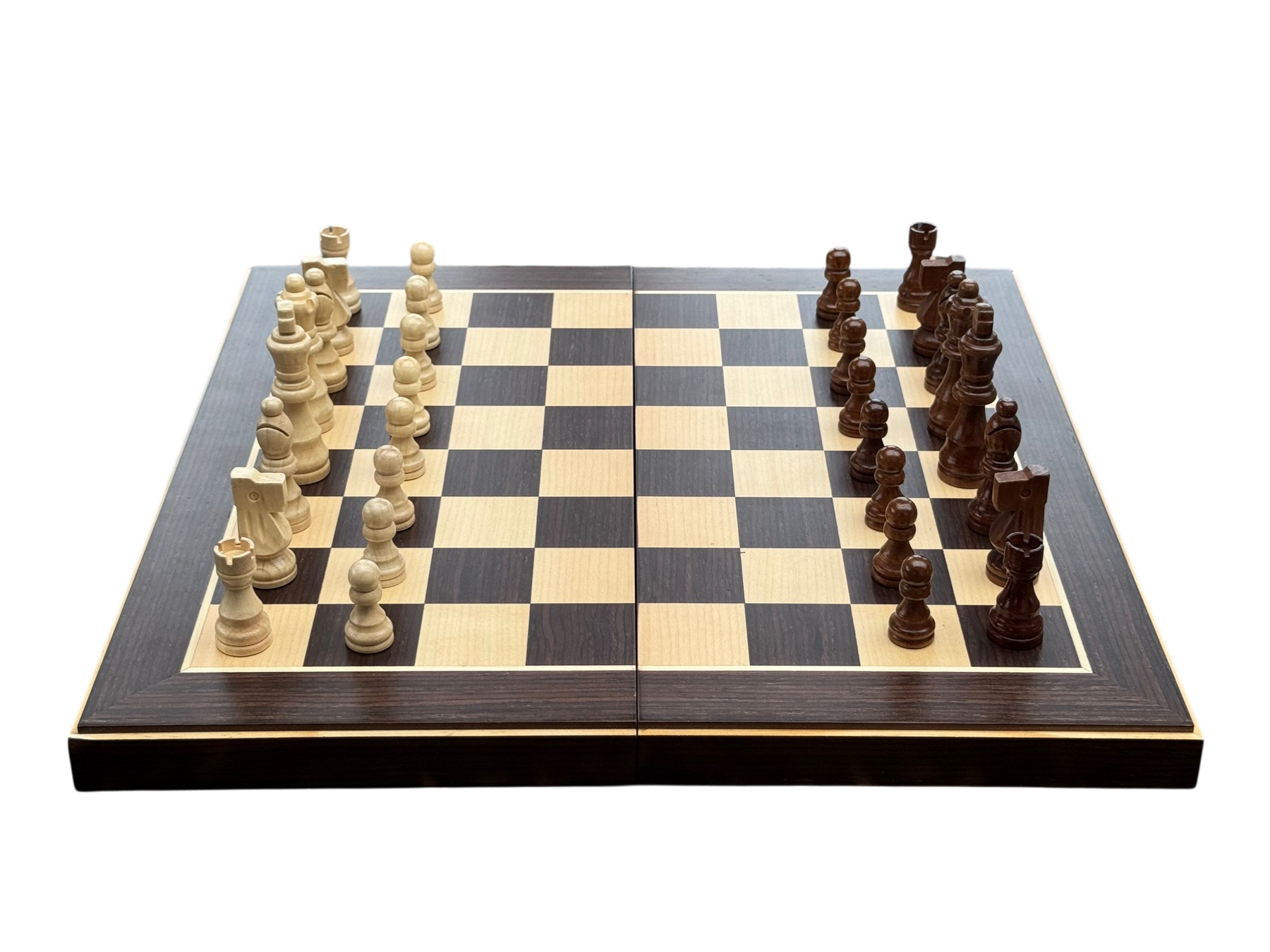 An accessible entry point chess set. This 15" folding set combines wenge ebony and maple wood veneers for visual contrast, with magnetic pieces that stay secure during play or transport.