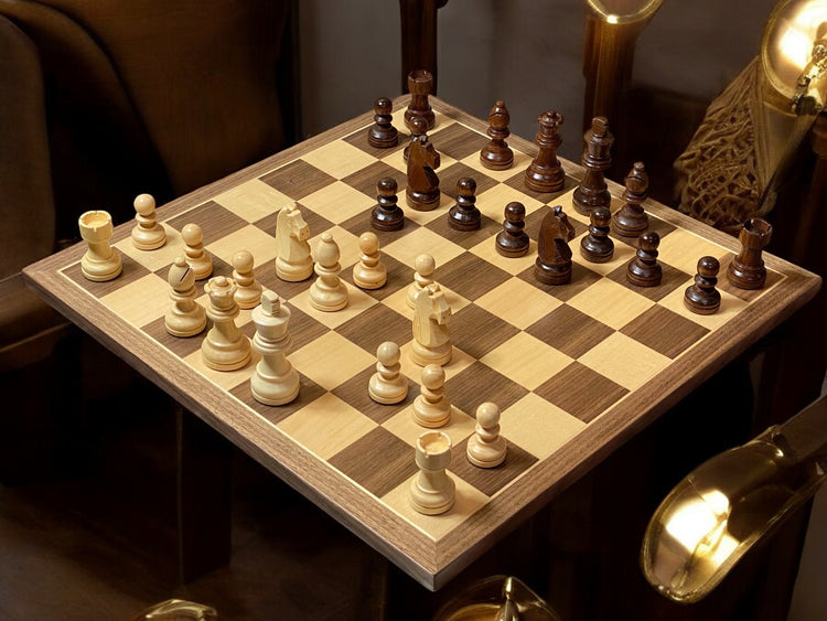 Walnut and Maple Chessboard: The 14 inch chessboard is veneered inlaid with high-quality walnut and maple, giving it a polished look and durable build. The warm tones of walnut and contrasting maple squares offer excellent visual clarity and an elegant playing surface for years to come.