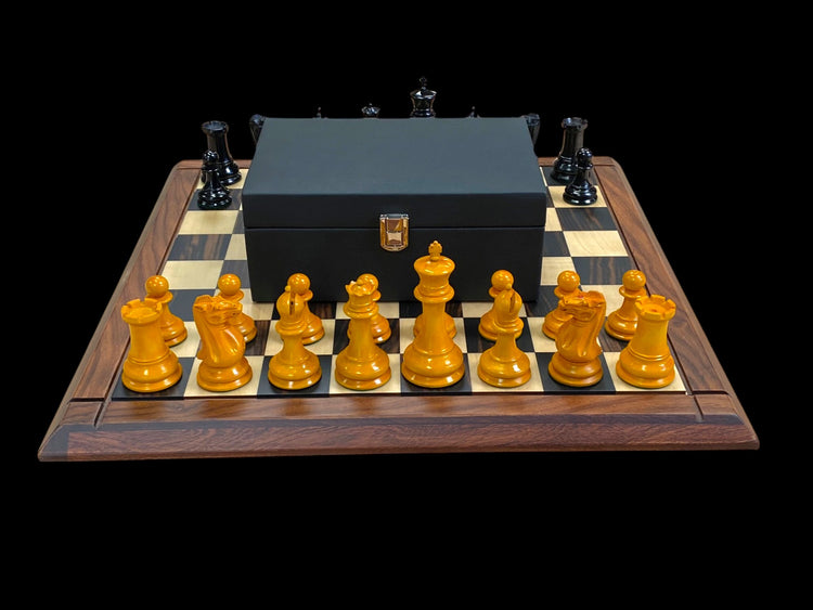 This distinguished set is complemented by a beautifully constructed 21-inch chessboard, crafted from a combination of ebony, maple, and golden rosewood, offering a rich, contrasting aesthetic that enhances the overall presentation. A durable vinyl chess box is also included for convenient storage and protection.