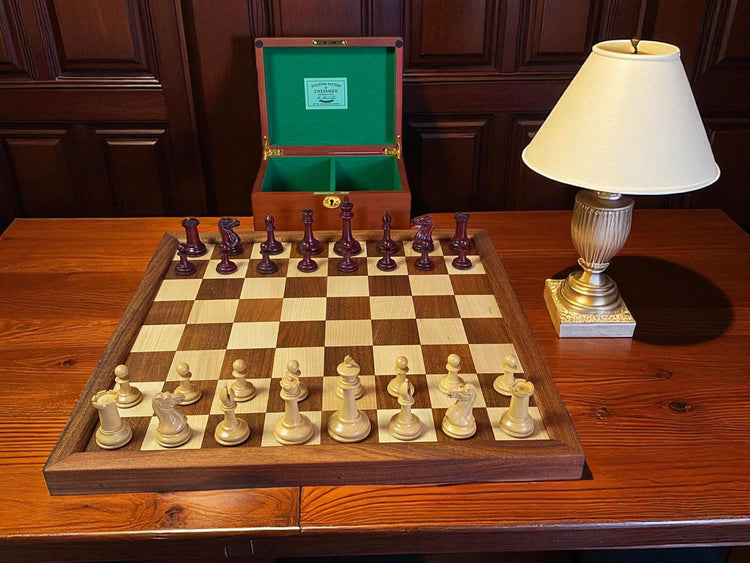 The 3.5" Cooke Claret Chessmen with Mahogany Framed Chessboard and Hinge Box presents a meticulously crafted top-level chess set that pays homage to one of the most iconic designs in chess history.