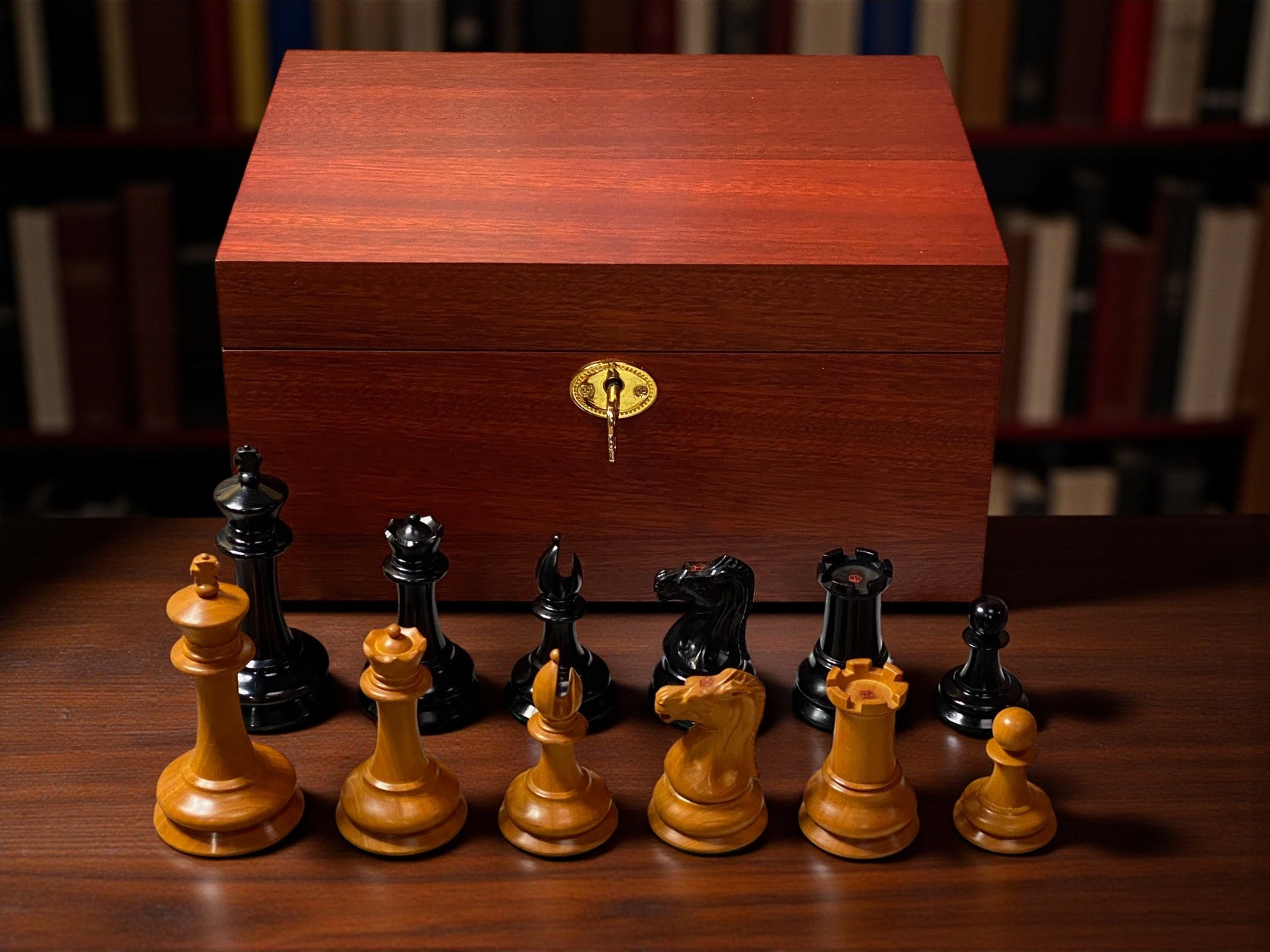 Each piece is hand-carved from premium boxwood and ebonised wood, then finished with a rich antique patina that evokes the warmth and character of the original 19th-century designs. The set features the graceful Leuchars Knight, distinguished by its classic posture and subtle detailing — a perfect embodiment of early Staunton refinement.