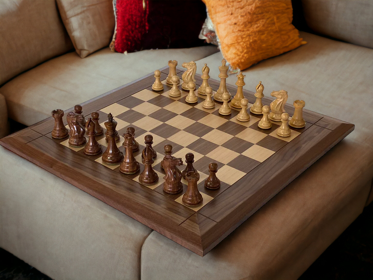 Our 3.5” Stallion Acacia Wide Border Walnut Chess Set & Box is a superb hand-carved chess set with a King Height of 3.5". It comes with Acacia and Hardwood Boxwood Weighted and Felted bases, matched with a 20" Walnut Maple wide border chessboard. This set also comes with a basic standard MDF veneer box to store pieces when not in use- Box style colour may change depending on the stock at the time of order.