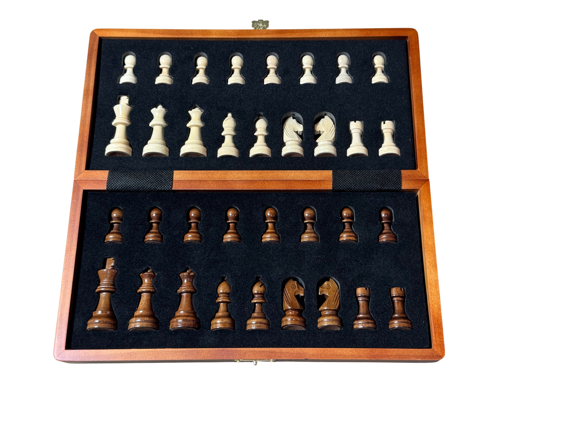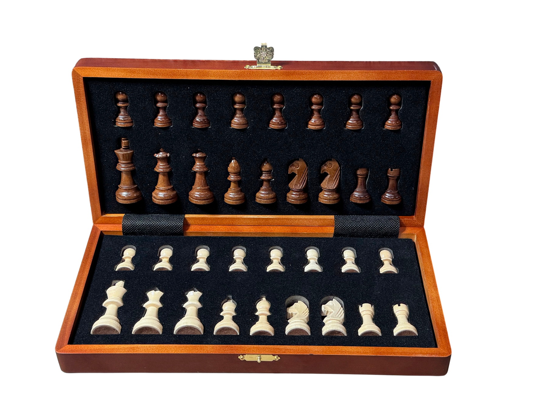 A practical entry-level chess set designed for beginners and casual play. This 12-inch folding magnetic chess set is crafted in a mahogany and maple style finish, a compact design for easy storage and travel.