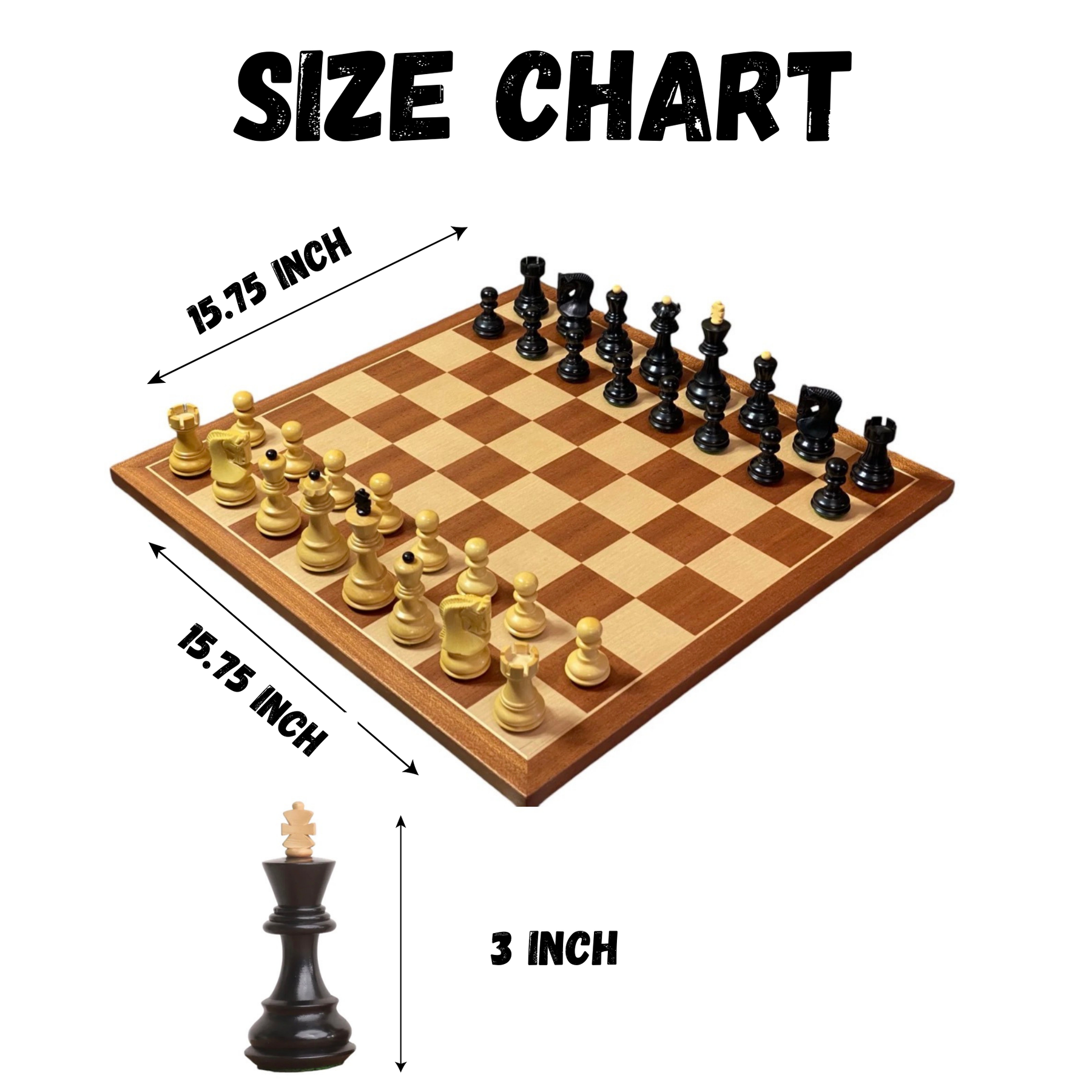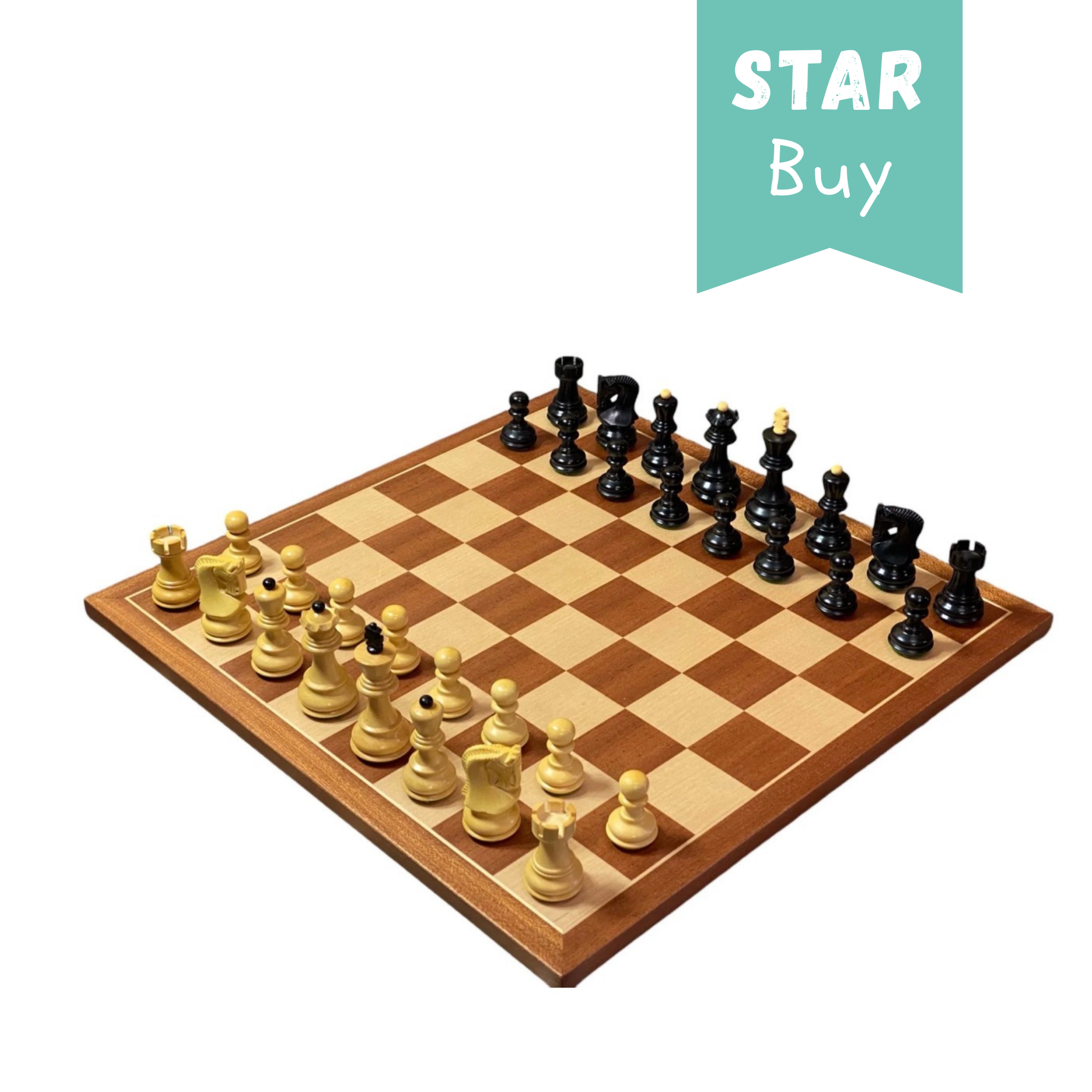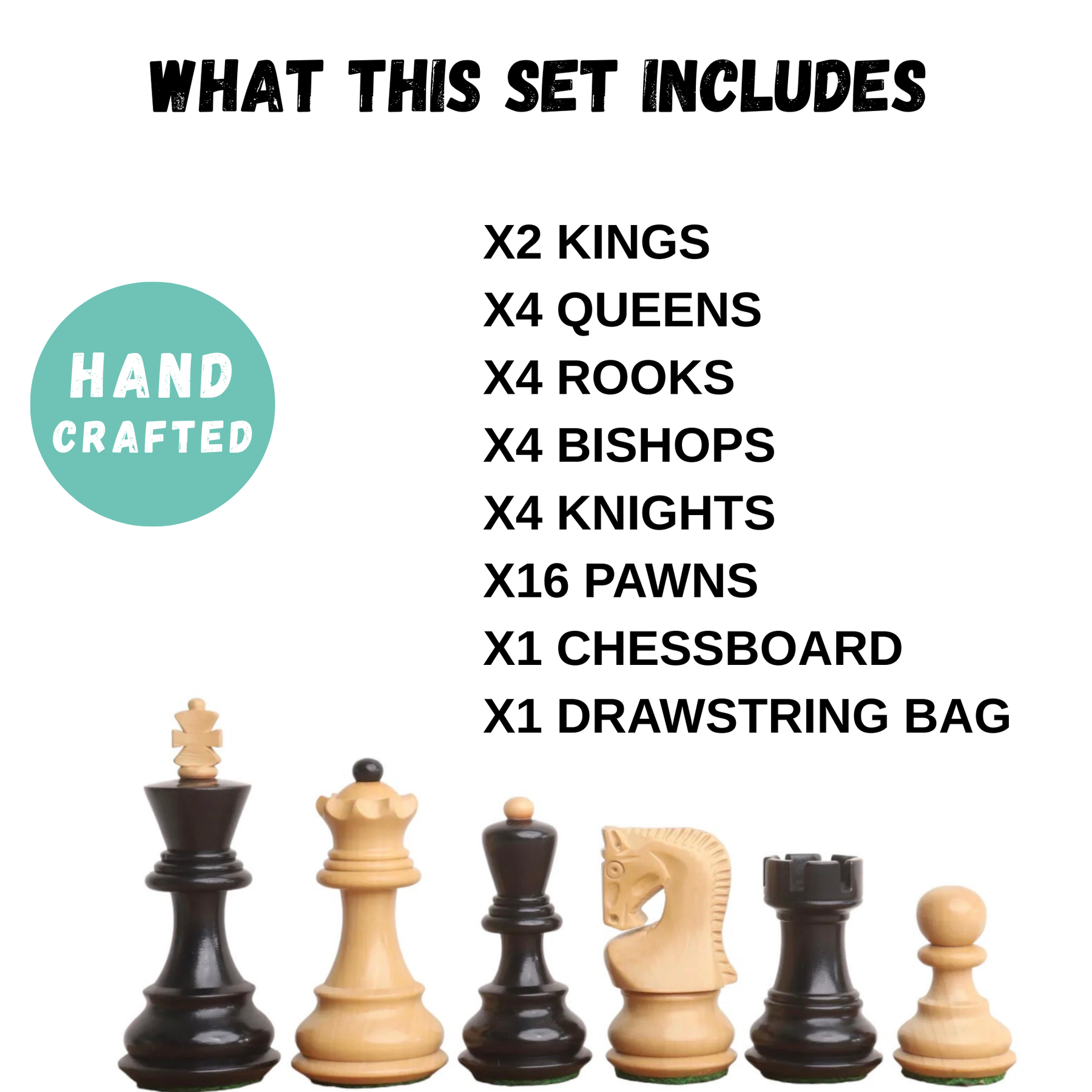 The 3-Inch Zagreb Russian Ebonised Chess Set includes finely carved pieces and a 15.75-Inch mahogany board. Complete with a drawstring bag, it offers classic style and practicality.