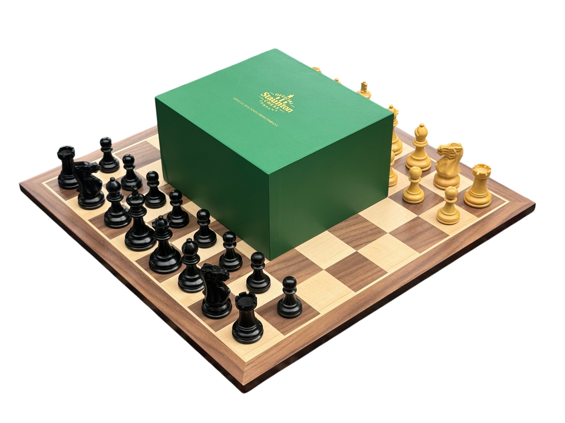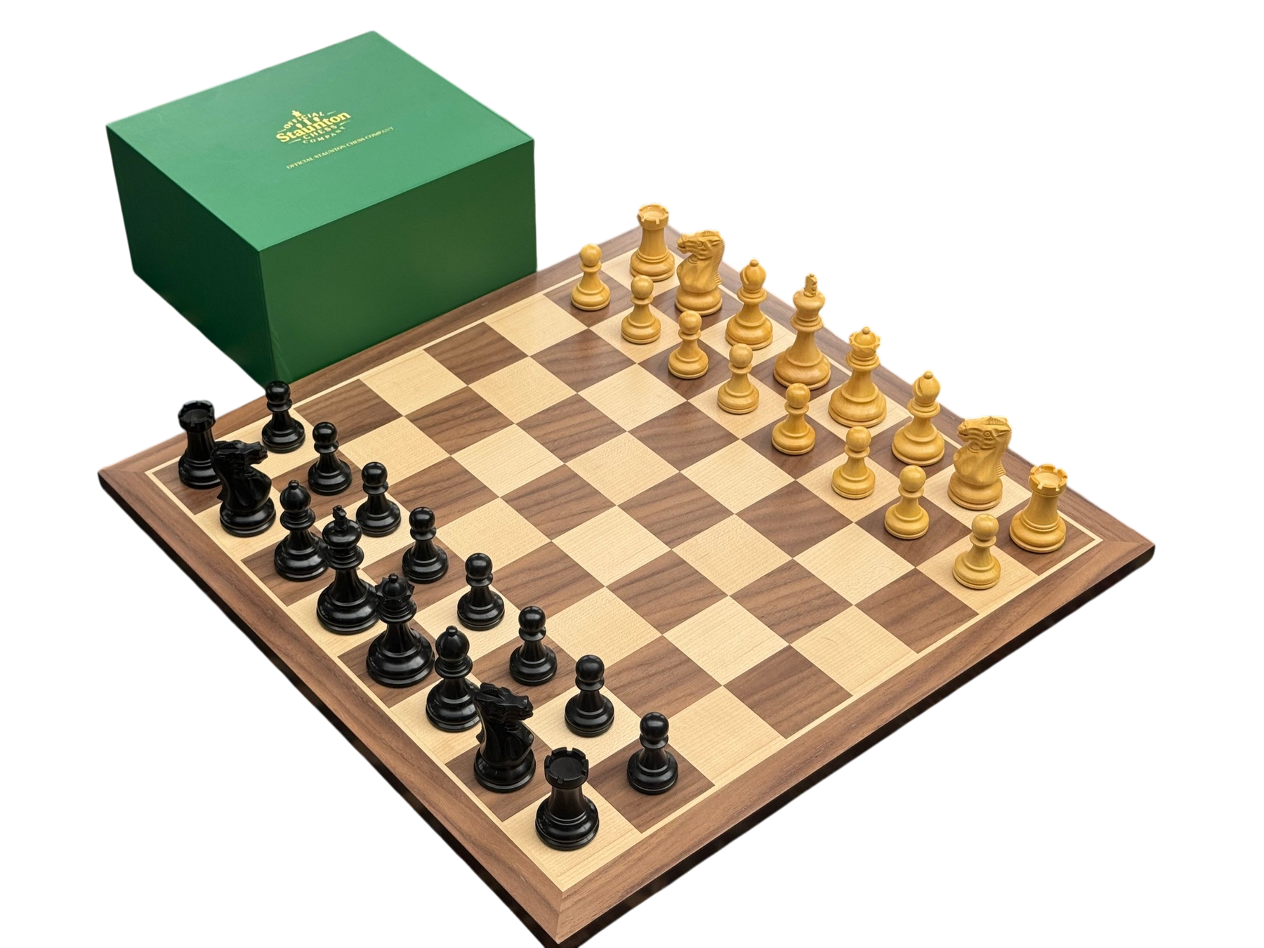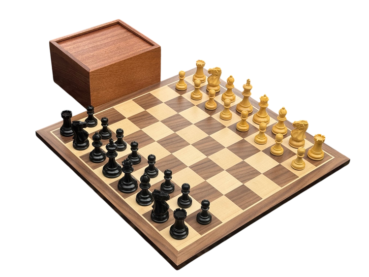 Elegant and refined, this chess set features ebonised Staunton pieces paired with a 17-Inch walnut board. Complete with a mahogany box, it’s crafted for enduring style and play.